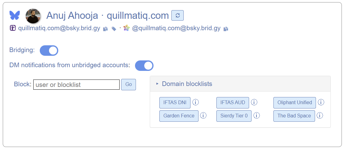 In November last year, we began developing additional user-facing moderation features for Bridgy Fed users. While blocking users across the bridge was always possible via DMs, we knew it would be easier for users to manage their lists on the Bridgy Fed settings page, and it would also enable us to add more complex blocking features.